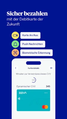 Mit der BBVA Mastercard Debit bist du immer sicher und flexibel unterwegs. Ihre innovativen Sicherheitsmerkmale wie der dynamische CVV, die fehlende aufgedruckte Kartennummer und die biometrische Erkennung geben dir volle Kontrolle. Aktiviere oder deaktiviere die Karte jederzeit direkt in der BBVA App. Bargeld beziehst du mühelos am Geldautomaten im Mastercard-Netzwerk weltweit oder ganz einfach an der Kasse im deutschen Einzelhandel. Überweise SEPA-Echtzeitüberweisungen gebührenfrei und bezahle kontaktlos mit deinem Smartphone, indem du die BBVA Debitkarte deinem digitalen Wallet hinzufügst.
