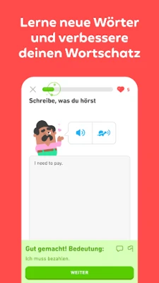Das Geheimnis von Duolingo liegt in einer einzigartigen Kombination aus wissenschaftlich fundierter Pädagogik und unwiderstehlichem Spielspaß. Vergessen Sie trockene Grammatikübungen; unsere gamifizierten Lektionen, belebt durch charmante Charaktere, verwandeln das Sprachenlernen in ein fesselndes Abenteuer. Entwickelt, um Ihr Langzeitgedächtnis zu aktivieren, schärfen Sie mit Duolingo spielerisch all Ihre Fähigkeiten: vom präzisen Sprechen über das flüssige Lesen und Verstehen bis hin zum korrekten Schreiben. Setzen Sie sich Ziele, verfolgen Sie Ihre Fortschritte und lassen Sie sich für Ihre tägliche Lernroutine mit Abzeichen und Belohnungen motivieren.