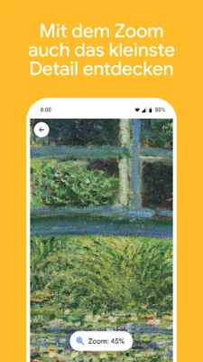 Google Arts & Culture bietet zudem tiefgreifende Einblicke und personalisierte Entdeckungen. Vertiefen Sie Ihr Wissen mit sorgfältig kuratierten Ausstellungen, erstellt von führenden Experten, oder betrachten Sie Kunstwerke in atemberaubender Detailtreue dank der Art Camera. Speichern Sie Ihre Favoriten in persönlichen Galerien und teilen Sie sie mühelos. Entdecken Sie zudem Kulturstätten in Ihrer direkten Umgebung oder reisen Sie durch die Jahrhunderte und Farbspektren der Kunstgeschichte. Mit der intelligenten Kunstwerkerkennung erhalten Sie umgehend detaillierte Informationen, selbst im Offlinemodus, und bleiben dank optionaler Benachrichtigungen stets über neue Inhalte informiert.